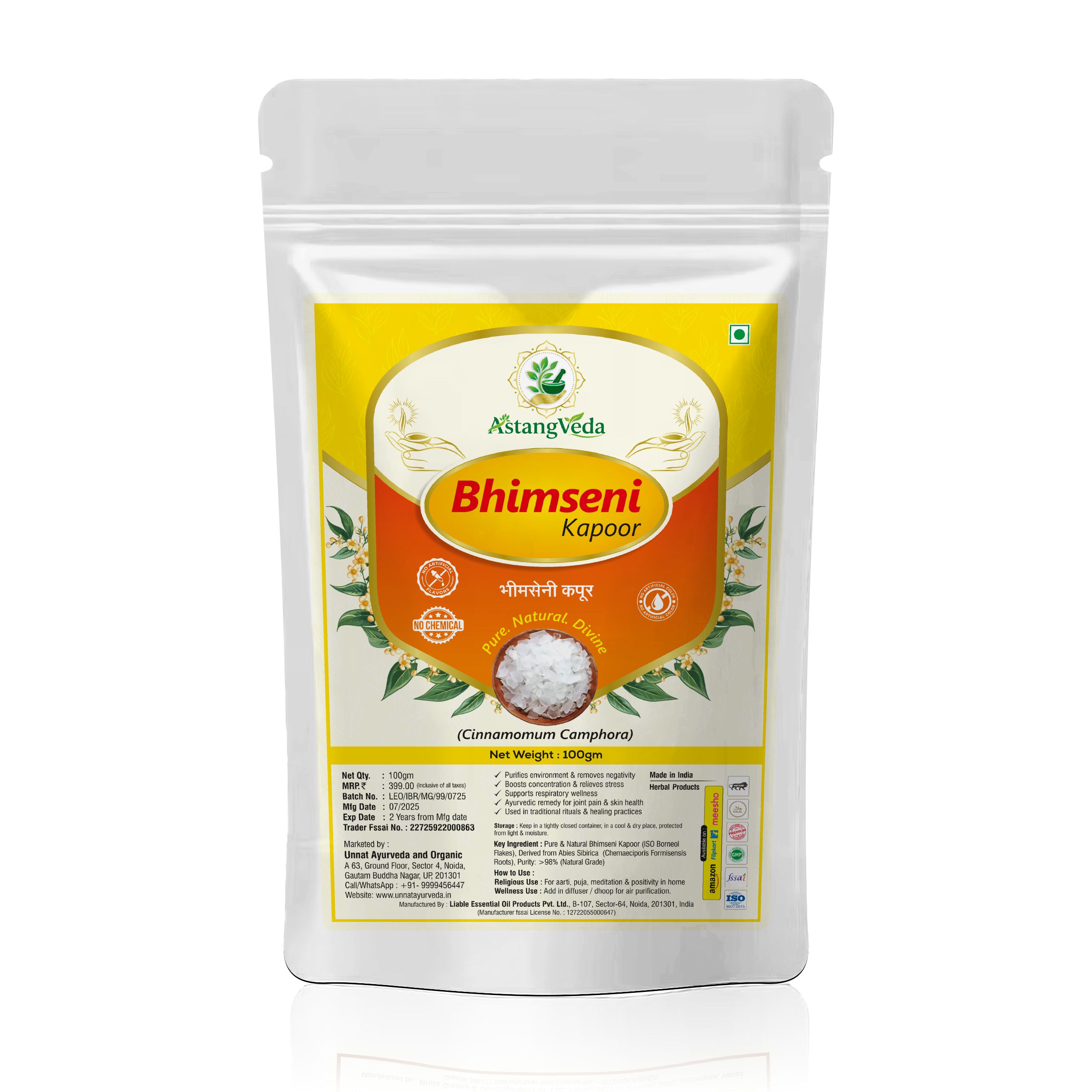 AstangVeda Bhimseni Kapoor is a premium-grade, 100% natural camphor traditionally used in Ayurveda and Indian rituals for its purifying and healing properties. Extracted from the wood of the camphor tree (Cinnamomum camphora), it is known for its strong fragrance and cooling effect that promotes calmness, focus, and positivity.